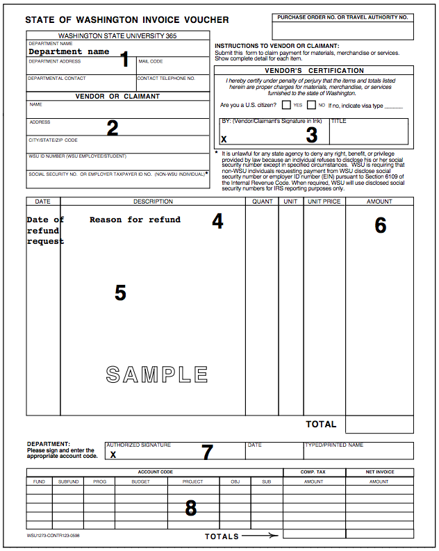 Complete a State of Washington Invoice Voucher for refund of purchases paid by cash or check (see Fig. 1). See also UPPM 30.45.) The department enters the following information on the invoice. The numbered instructions are keyed to the numbers on the sample.