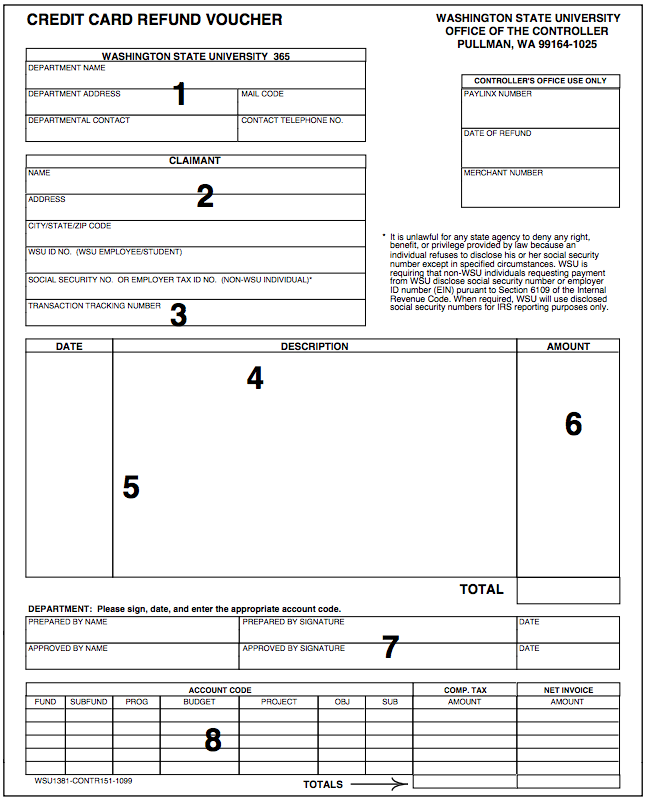 Complete a Credit Card Refund Voucher for each credit card refund. (See Figure 2.) Complete and/or print the Credit Card Refund Voucher to obtain copies of the form. The department enters the following information on the voucher. The numbered instructions are keyed to the numbers on the sample.
