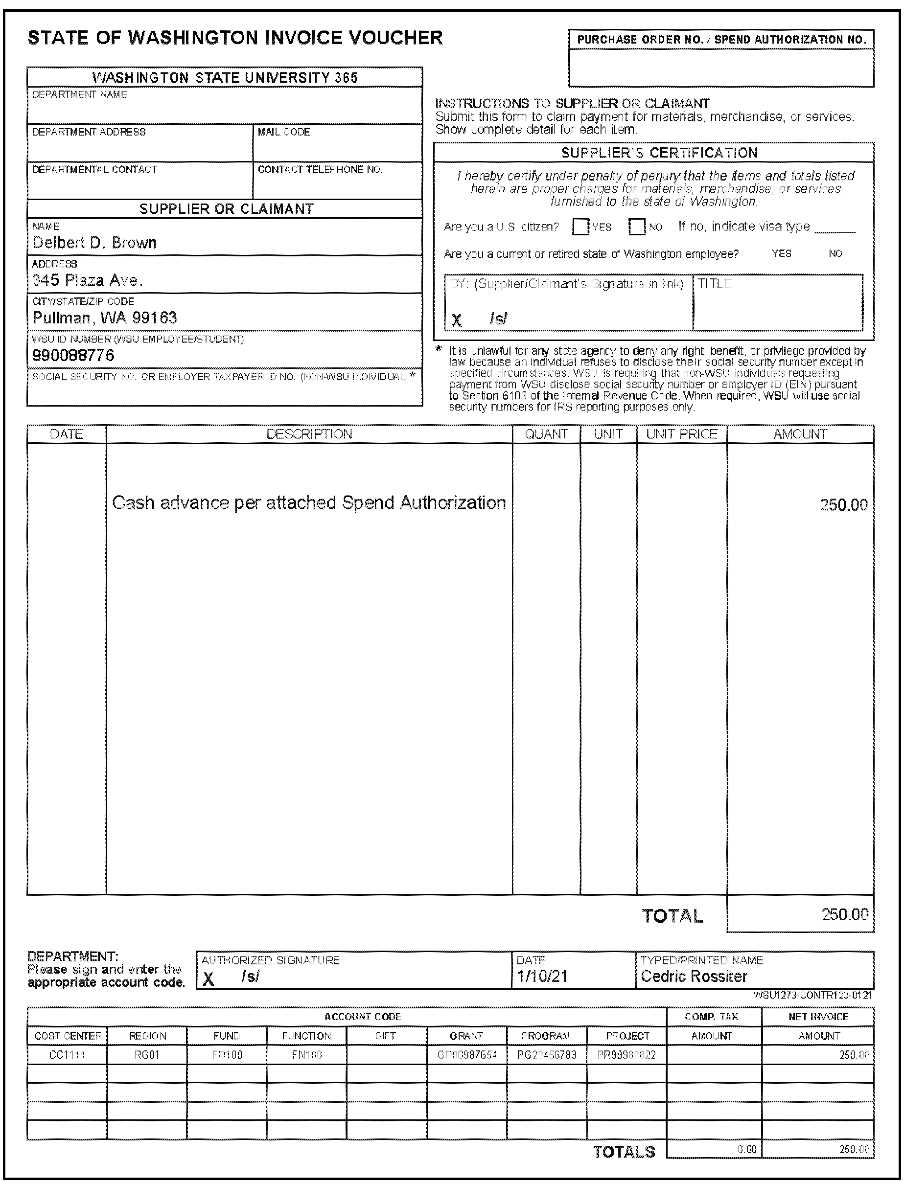 - State of Washington Invoice Voucher (attachment to the Spend Authorization in Workday)— This is filled out as indicated above under applying for a cash advance.