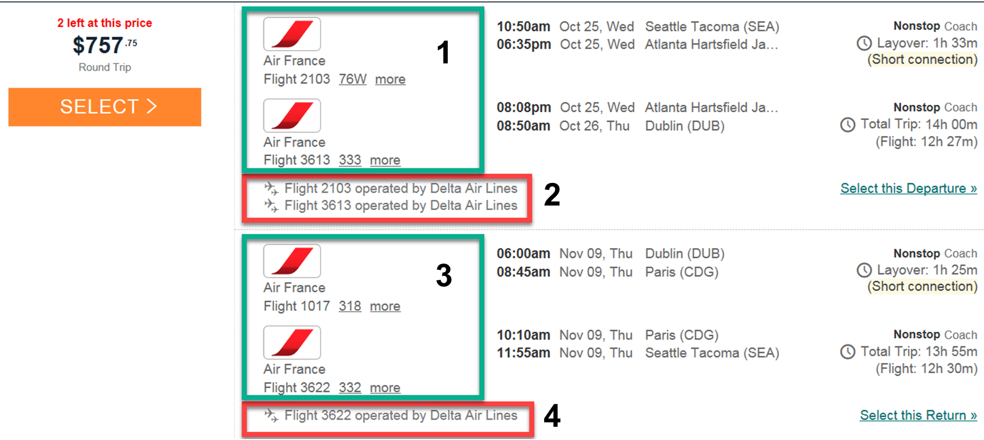 Green box (1 and 3): This flight is an Air France flight, but is operated by Delta Air Lines (as shown in the red box (2 and 4)). The traveler checks in at the Air France ticket counter. The boarding pass will include the Air France two-letter identification code.